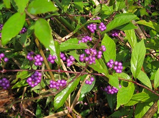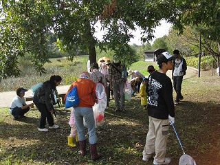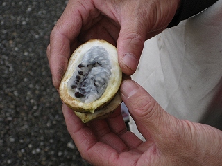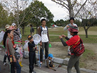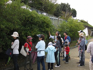 曇り空で開始前には雨が降り出し、参加者の出足も悪く心配していましたが、スタート前には雨も上がり人数もそろいました。指導員もたくさん集まりにぎやかに、今日のコースや内容を説明して出発。途中、クモの巣やフウノキの実の話をしたりしながら、生き物たちの谷コースを回ります。昨日からの雨のせいで足元が悪いので、子供たち期待の虫はなかなか出てきません。アラカシやスダジイ・クヌギなどドングリの実を探しながら進むと、次第に日も当たりだしタモを持った子供たちの歓声が聞こえてきます。木々の紅葉はまだまだですが、途中でアケビの実を取って食べたり、いろいろな色づいた木の実を観察しながらコースを巡りました。最後に今日観察した昆虫や草花などを話し合って終わりました。(記・板倉)