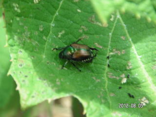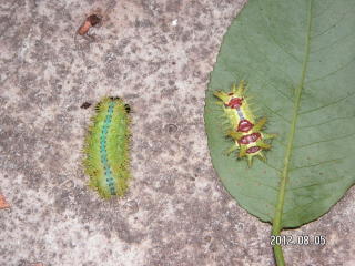 【左】左がヒロヘリアオイラガの幼虫、右がイラガの幼虫です       【中】ショウリョウバッタ      【右】マメコガネ