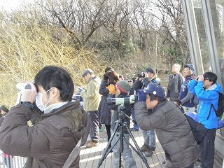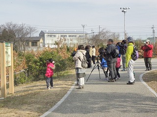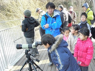 【左】セレトナのデッキから増田池の鳥、観察 【右】子どもも順番に