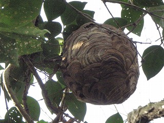 【左】ムクドリ 【中】鳥のご馳走になるハゼの果実 【右】籔に巣を作るコガタズズメバチ