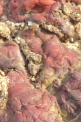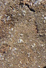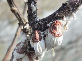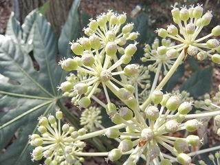 【左】マンネンタケの表面と管孔(うら) 【中】アカメガシワに付いたイセリアカイガラムシ 【右】花が終わり、実になりかけたヤツデ