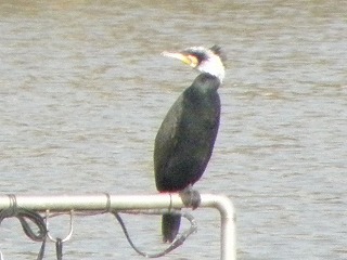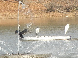【左】カワウ、首が白く繁殖羽 【中】左からカワウ、アオサギ、ダイサギ 【右】カルガモ♂と♀