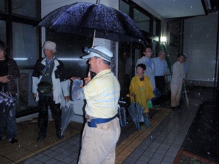 しかし、事前の問い合わせが4件ほどあり、関心を持たれていることは確かと自信を持ったが、天気ばかりはこの時期祈ってもなかなか聞き届けてはくれない。止みかけていた雨は始まる頃ドシャブリに。集合場所の前の道路は川のような流れに。当然灯火採集は中止、ホタル探しも