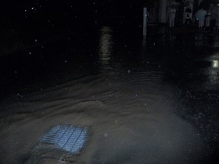 【右】子どもたちは興奮気味…きっと、初めての経験…暗い夜、どしゃ降り、冠水道路…