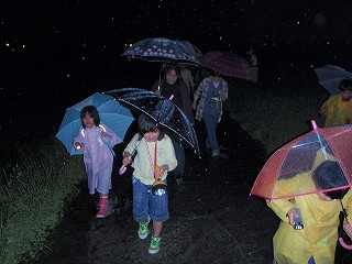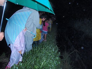 ただ、早くから会場にやってきて楽しみに待っていた子どもたちの心情を汲み、ホタル探しだけは有志で行うことにして、雨が小降りになった時を見計らって出発。ところどころ水たまりや冠水している農道を進み、川の堤まで来たがホタルの姿見えず。橋を渡ってさらに進み、左に曲がり、右に曲がって農事用排水路まで来たところ、水滴をいっぱい付けた草むらで光るものを発見。ホタルだ! 大人も子供も一斉に駆け寄る。「居た居た!」ボカー ボカー と2〜3秒間隔で薄青色、あるいは薄黄色に淡く光るホタルに一同感激。