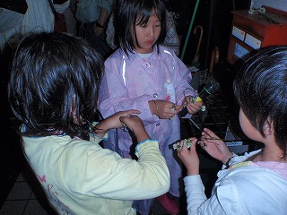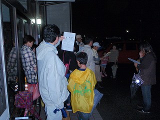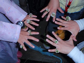 帰り道、子どもたちは正躬先生の指導でシロツメクサの指輪や腕輪を作って飾り、ときどき草の露がきらっと光るのを「おっホタル」と思ったりしながら9時前に出発点に帰着。雨のため配布を控えたホタルについて記したチラシを、そこで配り少し解説。数は少なかったが天然の本物のホタルに出会えた感動を胸に、雨の中、それぞれの家路につきました。