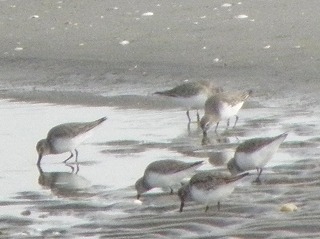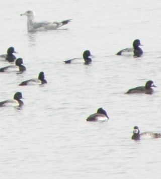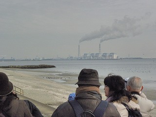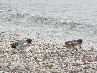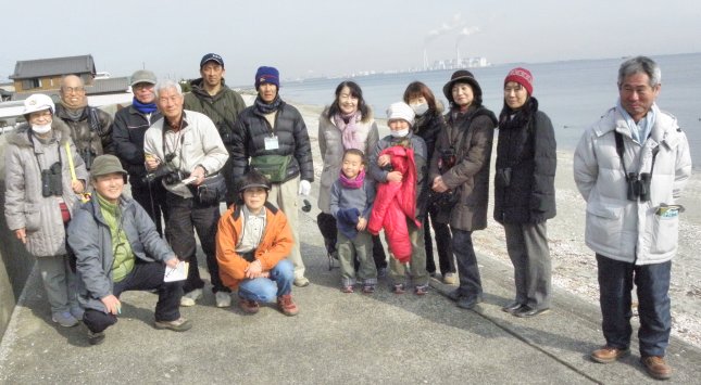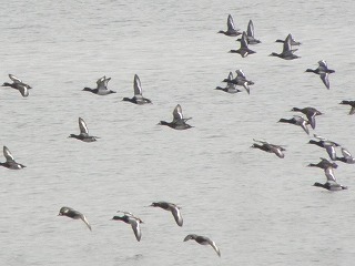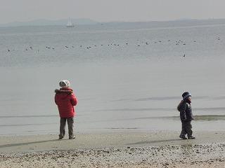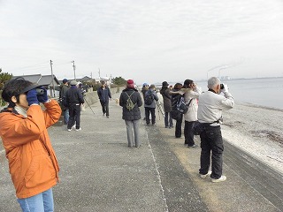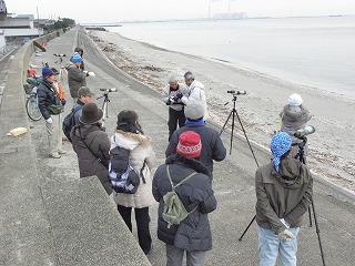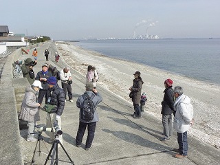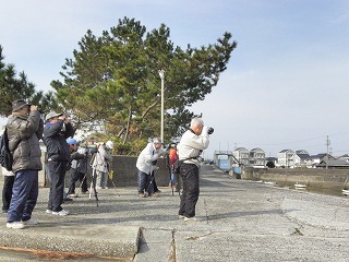 晴れて穏やかな、この時期としては断然暖かい日に恵まれた今日の観察会。波返しを越え、護岸堤に降りて海面を見ると、カモの類がビッシリ。おっ!今年は多いぞ」とうれしくなる。