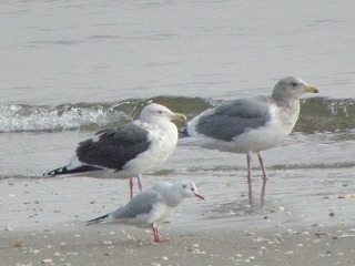 【左】上左、オオセグロカモメ。上右、セグロカモメ。下、ユリカモメ。         【中】コザギ         【右】ヒドリガモ。右雌