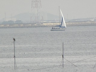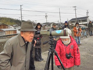 受付中に早速ミサゴが現れ、我々の頭上を旋回するように飛んで30秒程で南の方へ消えた。幸先よしである。目の前のカモの群れはヒドリガモ、スズガモ、ユリカモメで、200m×300mくらいの面積を覆っている。それ程に数が多い。海岸堤を北に向かって進んだが、気が付くと行く手沖に「かくだて網」が1基、復活されている。その真ん中辺の支柱にちゃんとミサゴがとまっているではないか。「おお、復活はありがたい」とすぐさまスコープで捉え、全員にしっかり見てもらった。今度は、海側に伸ばしたテトラポットの「消波堤」にイソヒヨドリを見つけスコープを覗けば、その色の美しさ・鮮やかさに皆さん感嘆。さらに丘側の垣根と電線上にジョウビタキを見つけ、みなさん口々に「今日来て本当によかった」との声。我々もうれしくなりました。