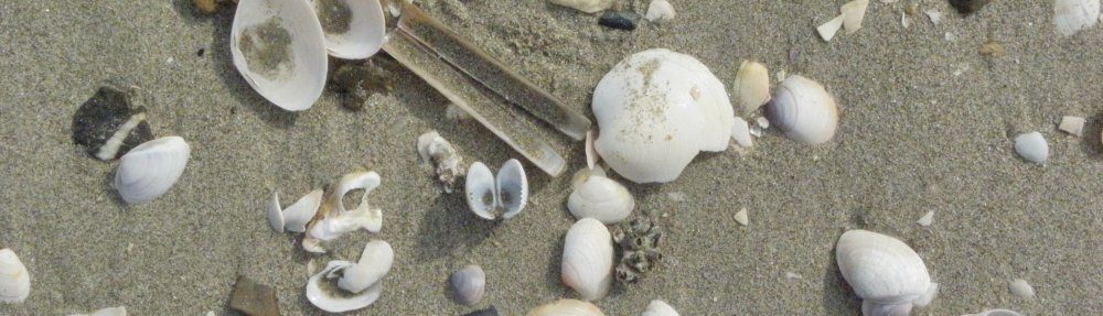 海岸の貝殻。シオフキ、アサリ、バカガイ、カガミガイ、カキ、マテガイなどの貝殻とフジツボが見られる。