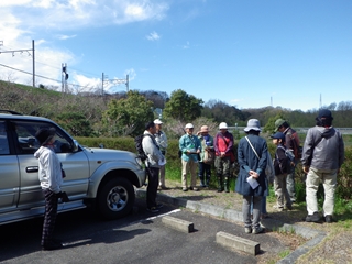 昨日の暴風警報まで出た「春の嵐」が去って今日は風が強いものの晴れて、まずまずの観察日和。開花が早かった今年のサクラがなごりのはなびらを散らしている。本日のコースと予定時間、見どころを伝え、さあ出発。