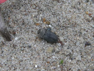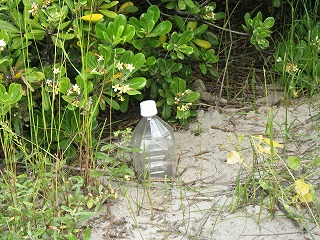 飛砂防止のため植えられたトベラの下に前日に設置したトラップを取り出してみた。中にはゴミムシダマシが10匹以上入っていた。