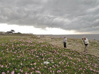 【中】11時、雨がポツポツと降り始めた中でハマヒルガオ群落を急ぎ撮影