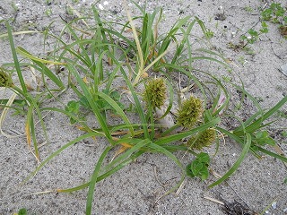 砂浜に降りコウボウシバとコウボウムギ(雌花が熟していた)の比較をし、ハマボウフウも花が咲き始めていた。