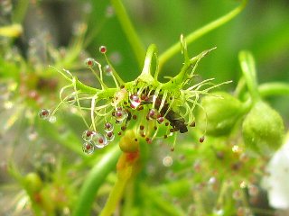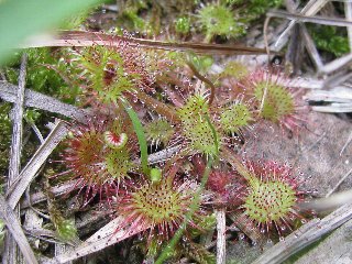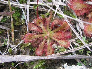 【左】コモウセンゴケ 【中】コモウセンゴケの花 【右】モウセンゴケ