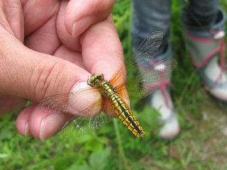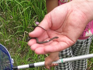 【左】溝の中で何か動いた! 【中】ヒバカリの赤ちゃんがいました 【右】トンボも捕まえました