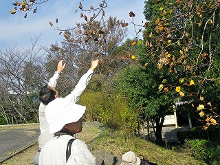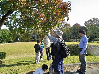 秋晴れ・小春日和の公園を30分ほど散策しながら、ドングリ(コナラ、シラカシ、スダジイなど)やナンキンハゼの実、ハンテンボクの種子、枝木、落ち葉などを集めました。芝生広場では紅葉したナンキンハゼが周辺に広がり、秋を目一杯感じさせてくれました。