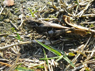 【右】芝生で見つけた、背中の◇マークが顕著なクルマバッタモドキ