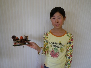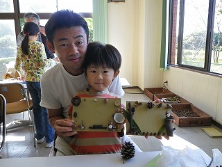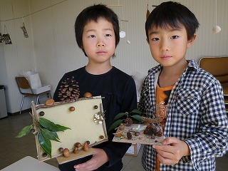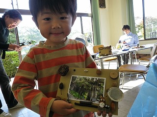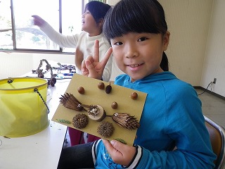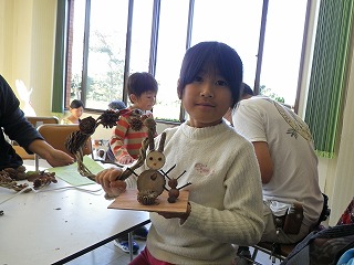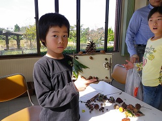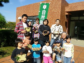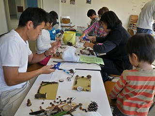 研修棟の臨時工作室にもどり、スタッフが持参した種子類、小枝、蔓、板紙も加えて材料が調いました。サンプルの写真立て、モビール、リース用リング等を用いてグルーガンの使い方、材料の利用方法を説明した後、自由に工作して頂きました。作業中には会話も弾み、誰もが夢中になって一時を過ごしました。また、持参した種子類には参加者にとって珍しいものも多く、度々質問も受けました。完成した作品は記念撮影した後、持ち帰って頂きました。大切に飾って頂けることを願っています。 (森田 記)