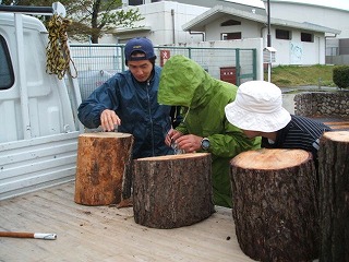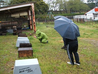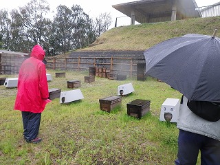 風雨が強い中、大曽公園長に準備して頂いた、松枯れ切断材の樹皮剥離観察とミツバチ農園でのセイヨウミツバチ観察のみを実施することにしました。