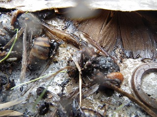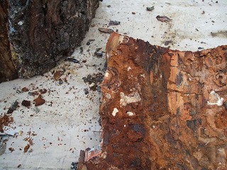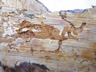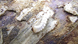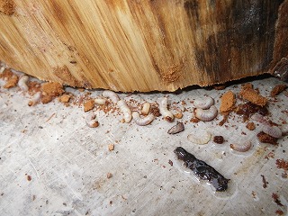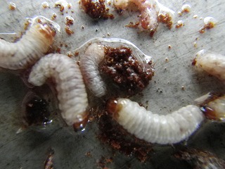 松枯れした樹皮(形成層)はカミキリムシ等の幼虫に虫食まれ、剥離すると沢山の幼虫が転げ落ちました。その幼虫を補食する寄生バチも飛び出しました。