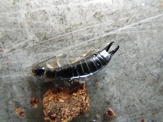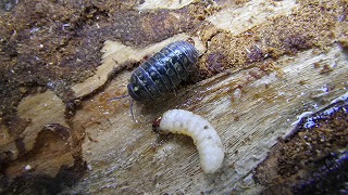 【左】マツノマダラカミキリの幼虫 【中】オカダンゴムシ (上) 【右】ヒゲジロハサミムシ