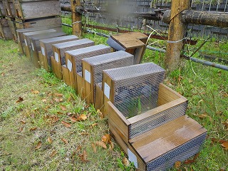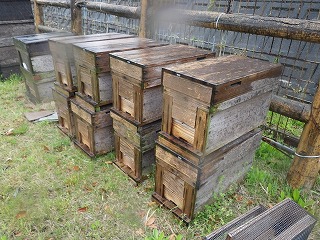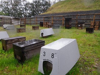 【左】使用中の養蜂箱と雨よけ 【中】養蜂箱の入り口に配備する網型スズメバチ・トラツプ 【右】養蜂箱予備 (越冬用)