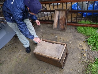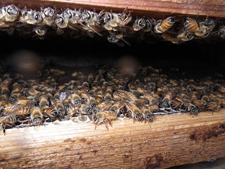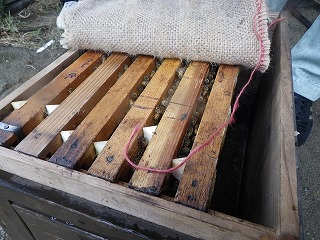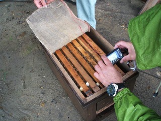 ミツバチ農園では養蜂業者が年間を通じて設置しておいてくれる養蜂箱を開けて内部の様子を観ることができました。