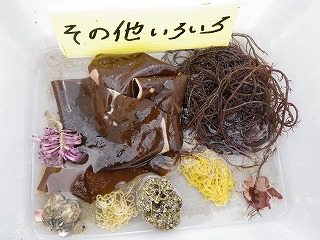 【左】スナギンポ? 【中】ギンポ 【右】アミメハギ 【左】マメコブシガニ 【中】ヒライソガニ 【右】イソガニ 【左】二枚貝・巻き貝 【中】その他いろいろ 【右】謎の卵塊 【左】海藻ミルに集まっていたワレカラ 【中】カコボラ(貝殻) 【右】ガザミ(稚蟹) 【蒲池海岸の昆虫】