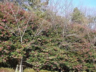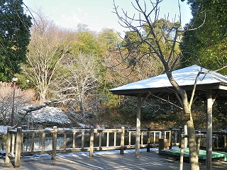 【左】雪景色   【中】東屋と公園池 雪景色  【右】集合場所のサザンカ(常滑市の花)、メジロが飛び交い鳴いていました。