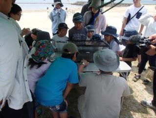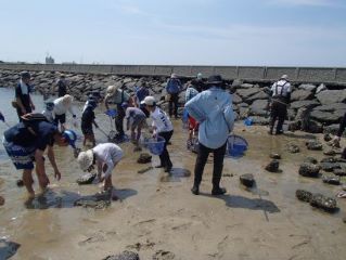 小魚やエビなどの隠れ場所となる、アオサなどの海藻類が、例年と比べ少なかったためか、魚類の捕獲数は、少なかった。潮が引いてあらわになった石の下や突堤の岩のすき間など、親子でじっくりと探し、カニや貝など数多くの生き物を観察できた。捕えた時の子どもたちの歓声が、あちこちで聞こえ、わが子のイキイキとした表情を見る父母たちも、とても嬉しそうだった。