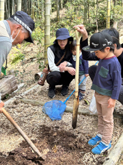 里山の恵みを探すもワラビはやや少ない。その分イタドリを持ち帰ってジャムにしようという参加者もいた。竹の子は階段の段ごとに出ているところもあり、少し入ると子供たちの竹の子探しの目はするどく、どの家族もおなかいっぱいになるほど持ち帰ることができた。また、竹の子と一緒にカブトムシの幼虫も出てくるところもあり、竹やぶに保全をして竹チップを敷いて腐葉土になり、豊かな土壌になっているからこそ大きな竹の子が出てくることを感じた。