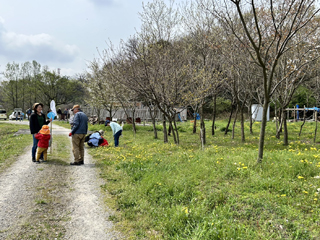 地面にはタンポポの黄色のお花畑が広がり、コオニタビラコ、オニタビラコも小さいながら葉をいっぱいに広げていたり、キツネアザミの数が減って場所が移動して植物たちのせめぎ合いを感じることもできた。竹灯籠の会や保全グループの代表の方に話を聞くこともできた。人のよく集まるところに、メリケントキンソウが生えていた。種がトゲトゲで裸足で歩いたり、犬が歩いたりするとけがをするという困りものなので、広がらないような対策が必要だと感じた。 (記 竹内秀)
