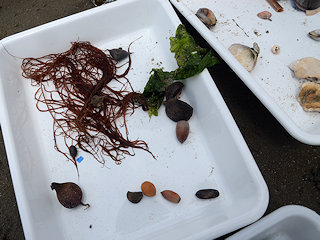 【上】漂着物は海藻のほかに、木の実、草の実、プラスチック製のものもありました