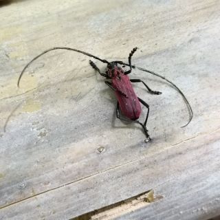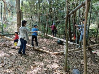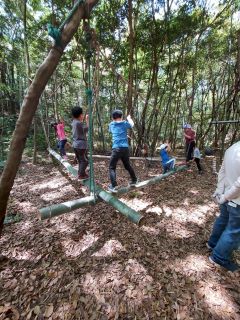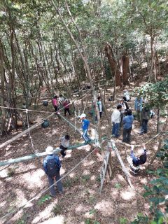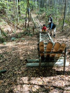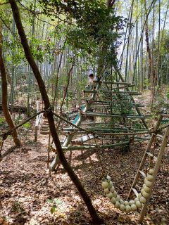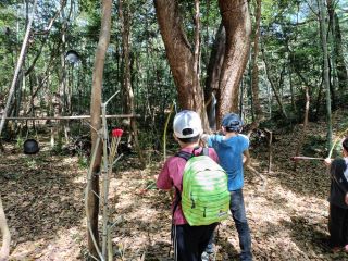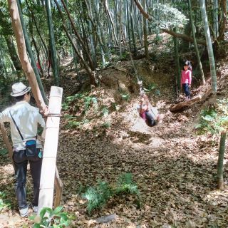 初夏の陽気で汗ばむほどの中、駐車スペースが無くなるほど大勢参加してくれました。あいさつの後、ヤギと戯れてから竹林へ向かい、様々な遊具で遊んだり筍を掘ったりして楽しみました。発案者であり数多くの遊具を作って下さった正躬先生に因み、まさみの森という看板を掲げました。竹林整備に始まり、纐纈さんの湧き出すアイデアのもと新たにジャングルジムやジェットコースター(トロッコ)など作った甲斐がありました。取り替えなかった竹が折れるアクシデントがありましたが、だれもケガすることなくアカカミキリの観察もでき、子どもたちも手伝って竹の取替をしてくれて満足のいく観察会でした。(記:平松裕)
