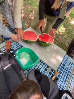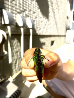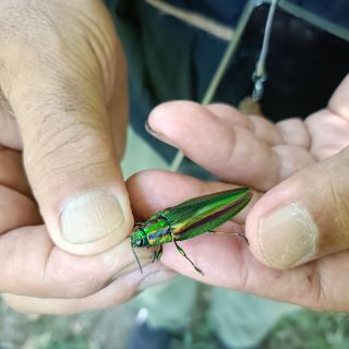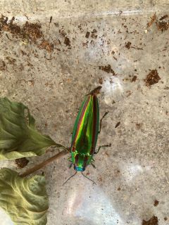 昼食持参で、変則的な時間で行ったが、昼食時間が曖昧に始まってしまい、ダラダラした観察会になってしまった。タマムシは櫓の上で飛び回るオスたちを観察でき、下ではメスを20匹ぐらい捕獲できた。纐纈さんがスイカを、安達さんがブルーベリーを差し入れてくださり、みんなで美味しくいただきました。反省点も多かったが、いろんな昆虫が採取できて楽しそうでした。榎並さんが入会されました。(記