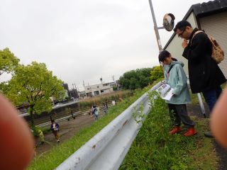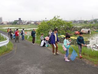 また、路傍の随所で見られたオレンジ色の鮮やかで目立つナガミヒナゲシの花が子供たちに人気でした。生憎の雨上がりで、昆虫特にテントウムシは見かけることができませんでしたが、代わりに、カエルの捕獲に精を出す子供たちでした。そして、知多市の天然記念物のマメナシや矢竹を観察し、ヤブニッケイの葉の匂いをシナモンみたいだと賑わいました。最後に未来館近くの休耕田でアオサギとカルガモを見かけ参加者から歓声が上がるなど大盛況でした。