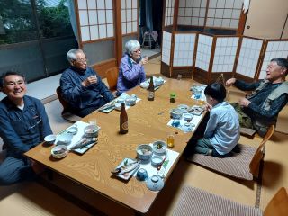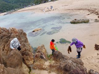 現在、廃炉措置作業が進められる原発「もんじゅ」「ふげん」を遠目から眺める。「水晶浜」に到着した時は一時的に雨がやみ、海岸を散策。その名の通り水晶のように美しい青い海と、石英質の(晴れていたらきらめくだろう)砂浜が見られた。海岸にはスナビキソウ、ハマヒルガオ、ハマゴウなど海浜植物が見られた。「年縞博物館」では、世界一の長さを誇る7万年・45mの年縞ステンドグラスを見学。お昼は福井県民のソウルフード、ソースカツ丼を美味しく頂く。午後からは、若狭湾に生息する魚と間近で触れ合う体験型の無料水族館「海浜自然センター」を見学。海の生きもの(ヒトデ、ヤドカリ、タコ、メジナ、カサゴなど)に触れたりエサやりができた。「かんにゃ棚田」は柵で閉まっていたので遠目から眺め、雨足が強まってきたので早めに民宿「きしの」へ。夕食までまだ2時間程時間があったので、霧雨の中、持参した釣竿を手に、宿から歩いて5分ほどの「矢代漁港」へ。海岸の石をひっくり返してゴカイを集め、ちょい投げ。まさかのヒット!釣れたのは、シロギス・アナハゼ・ヌメリゴチ・イトヒキハゼ。シロギスでかい!6人分のシロギスをと思い頑張るもタイムオーバー、5匹で終了。民宿にお願いしてシロギスは塩焼きにしてもらい、夕食時に出して頂いた。