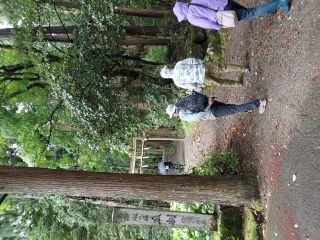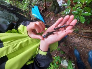 ●2日目も雨。「瓜割の滝」到着してすぐの場所に水汲み場を発見し、空のペットボトルに汲む。雨で湿った石やコケ、植物が生き生きと見え、美しかった。県天然記念物の樹齢300年の「上村家のタブの木」を見学し、昼食は「若狭街道熊川宿」で焼き鯖寿司を頂く。焼き鯖とすし米の間には生姜がはさんであり、すっきりとした味で美味しかった。「山門水源の森」では姿は見られなかったが、モリアオガエルの鳴き声が聞こえた。山門湿原付近を散策。雨のせいか、トンボやチョウなど昆虫類は見られず。林の中で何匹かアカハライモリを見かけ間近で触れ合えた。