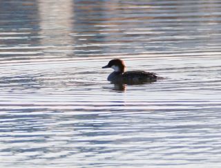その後、背戸之池に集まっているカモ?を古川さんのセットした望遠鏡で覗いたりして、多くに人がカイツブリではないかとの声であったが、古川さんの詳細な観察でミコアイサの雌であることがわかりました。