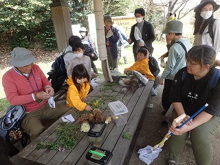 ◎植物(花):シロツメグサ、カラスノエンドウ、オオイヌノフグリ、タネツケバナ、ナズナ、ハナイバナ、キュウリグサ、スミレ、ホトケノザ、ヒメオドリコソウ、スズメノカタビラ、スギナ(ツクシ)、セイヨウタンポポ、トウカイタンポポ、スイバ、ヨモギ、ワラビ、セリ、アケビ、ヤダケ、ヤマザクラ、ヤブタビラコ、コオニタビラコ、ムラサキケマン、アオキ、ノビル、イタドリ、ヤエムグラ、ハルジオン、