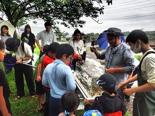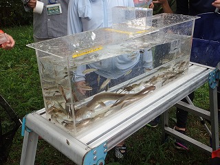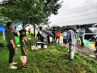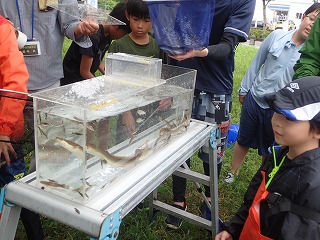 タモの数が多いというのはすごいもので、1時間と少しの時間でたくさんの生き物が採集できた。何にもとれないと座り込む子供がいる一方でちゃんとウナギを捕らえている大人もいた。濁った川の水に泳ぐ魚を澄んだきれいな水の水槽に入れると、姿形がはっきりし、特徴もよくわかる。種類分けの水槽にいれるのは「若い」スタッフたち。手慣れたもので指導員もそれを捕まえてくれと、頼んでいる一幕もあった。分け終わると、種類ごとにどんな生き物なのか詳しい説明を聞いた。ウナギを始め、食べ方の話になると大人たちは前のめりになっていた。解散する頃になるとまた雨がぱらつき出した。 (記 竹内秀)