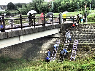 参加者は環境課を通しての参加者と、豊田自動織機関係、イオンのTシャツを着た参加者。週の前半よく雨が降ったので水かさや濁りを心配したが、濁りも少なくほどほどの深さ。参加者が多いことと途中で雨が降って急に避難ということも考えてはしごは3本。川の上の方のコンクリートの護岸は滑りやすいことが分かってなるべく草の斜面を降りるようにした。