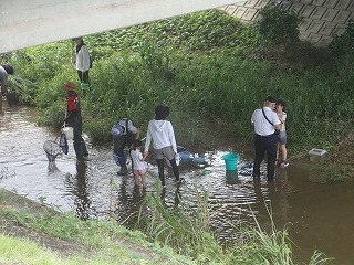 今回も、1時間と少しの時間でたくさんの生き物が採集できた。最後に採取したものを水槽に入れ、種類ごとにどんな生き物なのか、説明をした。大中小と3通りの大きさのものが見つかった。太平洋の真ん中から旅をしてくるのだと思うとなんだか不思議な気持ちになる。テナガエビの手はなぜ長いのかのクイズに、手の長いのは雄で結婚するために雌を捕まえるため、と聞くとへえ〜の声が聞かれた。今回は、カメは捕まらなかった。 (記・竹内秀)