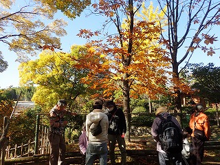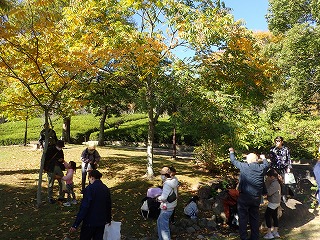 風もなく青空に紅葉した葉が映える暖かさを感じる日となった。於大公園の中を1時間ほど散策して秋の宝物を探した。今年も記録的に暑い夏となり、いつまでたっても秋が感じられなかったが、やっと朝夕が冷え込むようになり、公園全体が赤や黄色に彩られた中を散歩した。コナラのどんぐりやクヌギ、しましま模様のアラカシどんぐりをたくさん拾った。ハクウンボクの実は不作。ガマズミの酸っぱい実を味わった。カツラの落ち葉はプリンのカラメルのような良い香りがして、みんなで袋に詰めて持ち帰った。