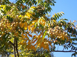 真っ黒いムクロジの実は今年は豊作だが自然のサイクルが遅くなって、まだたくさん木に付いてた。いろいろと観察しながら、工作用の材料の宝物を集めることができた。