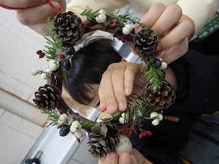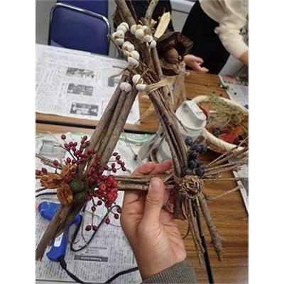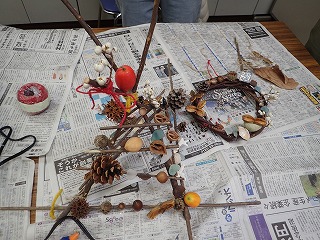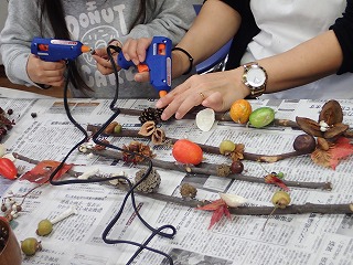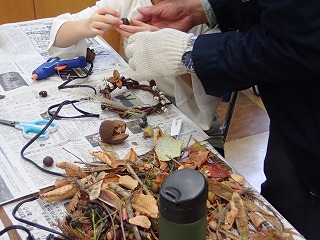 このはな館の部屋の中で、拾った落ち葉や木の実、指導員が持ってきた木の実や枝・ツルなどの材料とグルーガンを使ってそれぞれオリジナルの作品作りをした。(記・竹内秀)