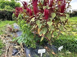 今年は梅雨明けも早く、降水量が例年の半分ほどだとか。それでも、薬草園の世話をしてくださる職員の方々のおかげか、アマランサスやバジルなど季節のハーブ類の花が咲いていた。最初に薬草園の実習室で捕虫網の使い方の説明などを聞いた後、外へ。目の前に広がる草原に三々五々広がってバッタ類を捕まえたり、チョウを追ったりした。だんだんと周りのハーブ園を時計と反対にぐるりと回り、実習室へ戻った。セミの抜け殻をコレクションしている子、タモを振り回してチョウを無事捕獲した子、クマゼミを捕まえられた子、だんだんとタモよりも手でバッタ類を捕まえられるように進化した子など、それぞれの楽しみ方で虫を捕まえていた。