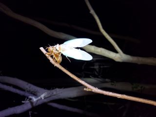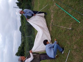 風で白布があおられてはいたが、明かりを点灯すると、ゴマダラチョウ、スズメガ、ドウガネブイブイなどの昆虫が集まりはじめた。