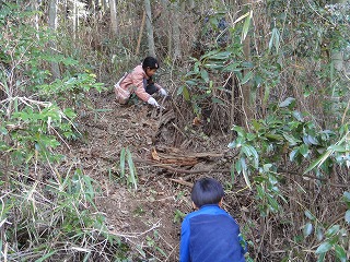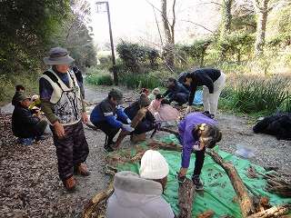 【左】朽ち木解体、観察広場 【右】「語り部」と子どもたち
